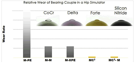Silicone nitride (Si3N4) implants are synthesized with 6 wt% yttrium oxide and 4% alumina ceramic. SiN is 3x harder than CoCr and alumina is bout 3.6x harder than CoCr. In terms of strength, the alternate ceramics SiN and ZrO2 average 3.1 times stronger than alumina. These are stronger than even the alumina-matric composite ceramics (Biolox delta TM).