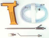The CO2 lavage system consists of a reusable hand piece and a variety of nozzles, along with a pressure regulator needed for use with standard CO2 tanks (Figures 2 and 3). The sterile CO2 tube set features appropriate quick disconnect fittings and an in-line microbial filter for filtration purposes.