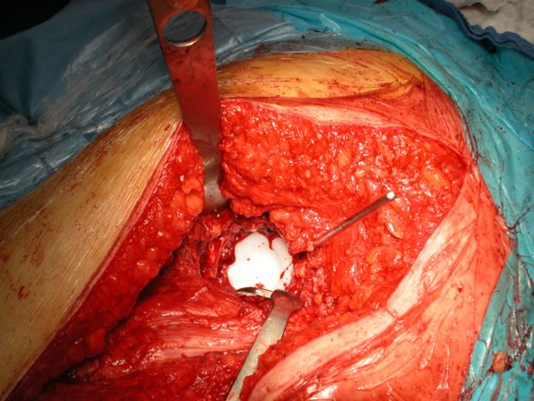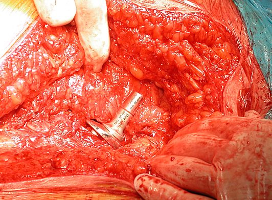 The stem is designed to use standard conventional cementing techniques. The shape of the stem is trapezoidal and along with a proportionally designed collar provides for optimal impaction and compression of bone cement. In addition, a teardrop shaped recess on the anterior and posterior portion of the implant increases the cement to prosthesis interface therefore increasing resistance to axial and torsional forces